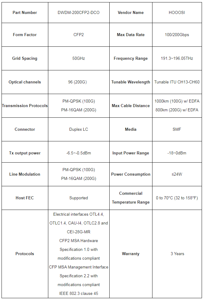 CFP2-DCO Coherent transceivers support flex-grid DWDM tuning and provide 200GBase-DCO throughput up to 80km over single-mode fiber (SMF) using a wavelength of 1529.16 to 1567.13nm via an LC connector. Digital optical monitoring (DOM) support is also present to allow access to real-time operating parameters.
