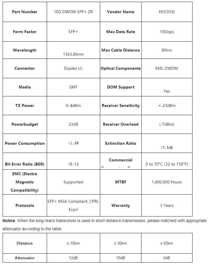 DWDM-SFP10G-63.86 compatible SFP+ transceiver supports up to 80km link lengths over single-mode fiber (SMF) via an LC duplex connector. This transceiver is compliant with SFF-8431 and SFF-8432 MSA standards. Digital diagnostics functions are available via a 2-wire serial interface, as specified in SFF-8472, to allow access to real-time operating parameters. With these features, this easy to install, hot swappable transceiver is suitable to be deployed in the DWDM networking equipment in metropolitan access and core networks.
