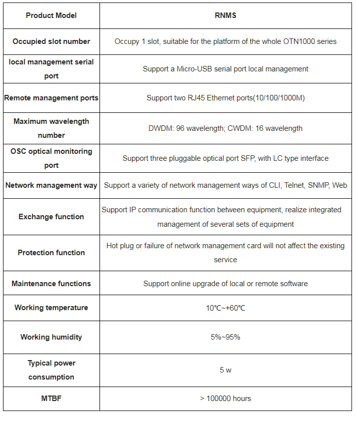 RNMS is a network management function module launched by HOOOSI. which is specially designed for OTN1000 series products; its main function is to provide interfaces for equipment and network management systems. The module, together with the OTN1000 series NMS network management system, completes each single-board management and transmission of various maintenance and management signal for each network element, realize the real-time monitoring, maintenance and management for equipment network elements and the whole synchronous equipment network, thus offering a good solution for equipment monitoring.
